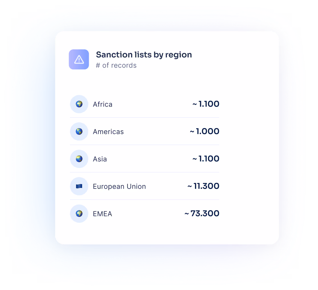 Stay compliant and protect your company. Screen potential customers against global sanctions lists, PEP databases, criminal registries, and negative news – all via one seamless API.
