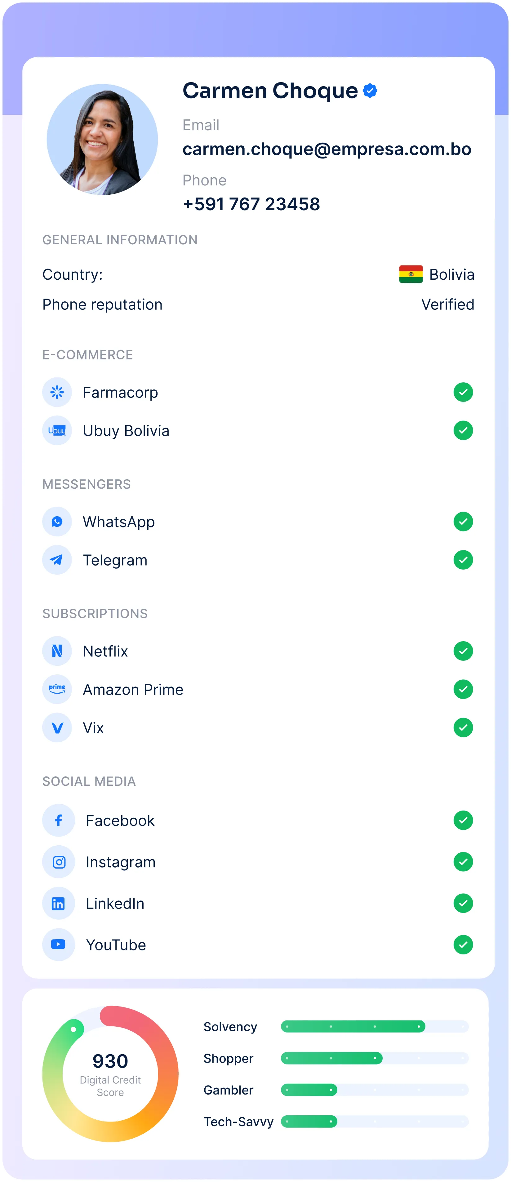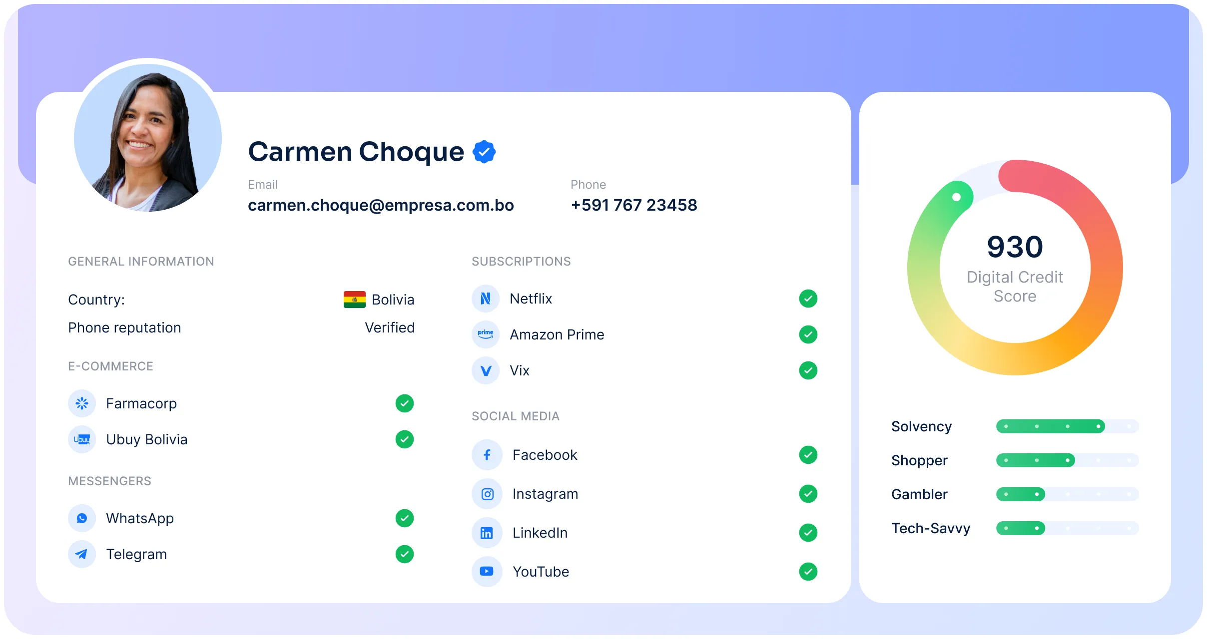 Impulsa los préstamos inclusivos en Bolivia con una solución de calificación crediticia digital diseñada para mercados en desarrollo. Más de 400 señales de datos alternativos por solicitante.