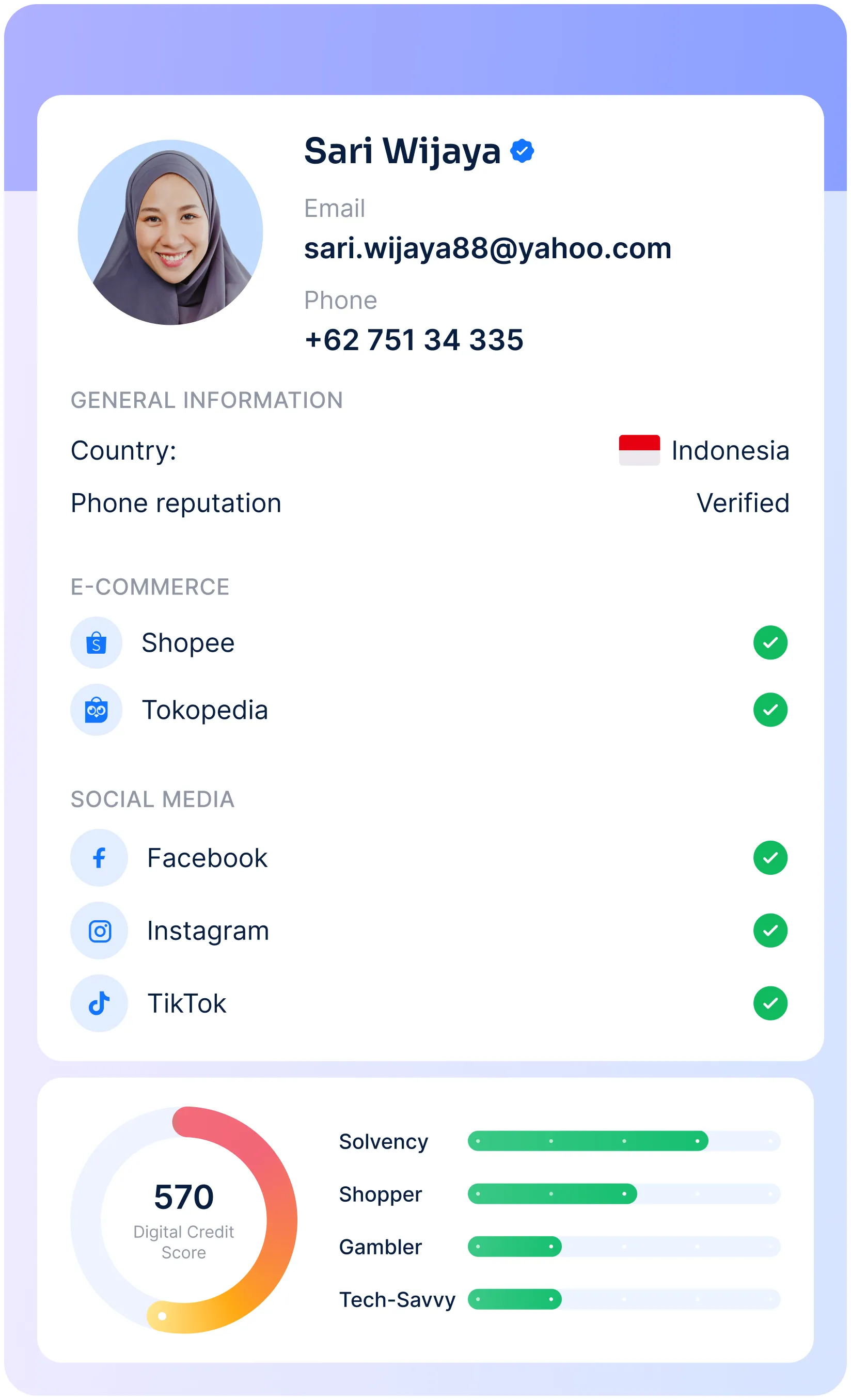 Discover trustworthy borrowers in Indonesia, even with limited credit data. Get 400+ data points per applicant, gathered from global signals and local platforms.