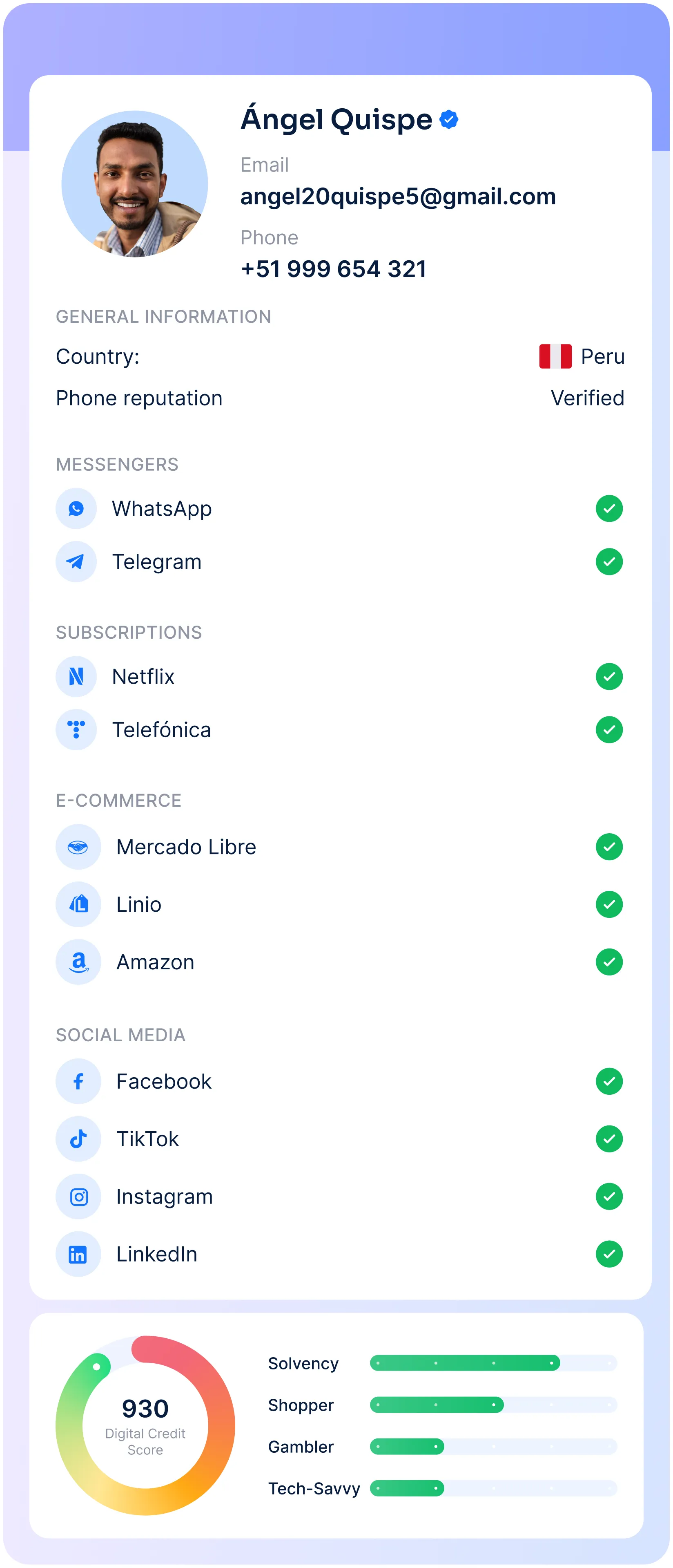 Unlock smarter lending decisions in Peru with a digital scoring solution built for underserved markets. 400+ data signalsper applicant.
